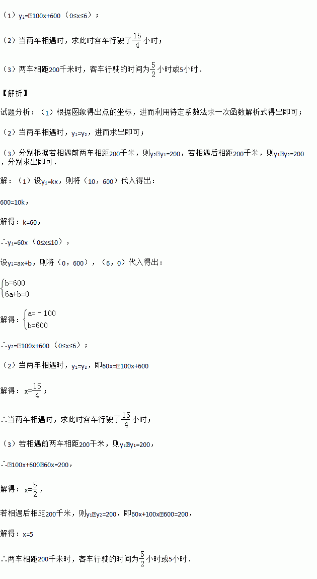 (1)y2=﹣100x+600 (0≤x≤6); (2)当两车相遇时,求此时客车行驶了小时; (3)两车相距200千米时,客车行驶的时间为小时或5小时. 【解析】 试题分析:(1)根据图象得出点的坐标,进而利用待定系数法求一次函数解析式得出即可; (2)当两车相遇时,y1=y2,进而求出即可; (3)分别根据若相遇前两车相距200千米,则y2﹣y1=200,若相...