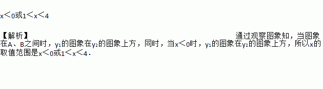 如图,一次函数y1=ax+b(a≠0)与反比例函数(k≠0)的图象交于A(1,4)、B(4,1)两点,若y1>y2,则x的取值范围是________.