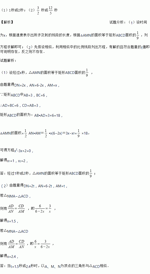 如图,已知矩形ABCD的边长AB=3cm,BC=6cm.某一时刻,动点M从A点出发沿AB方向以1cm/s的速度向B点匀速运动;同时,动点N从D点出发沿DA方向以2cm/s的速度向A点匀速运动,问: