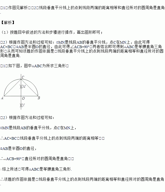 请根据小美的作法,用直尺和圆规作以AB为底的等腰直角三角形ABC,并保留作图痕迹.这种作法的依据是 .