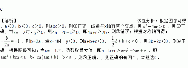 二次函数y=ax2+bx+c(a≠0)的图象如图,给出下列四个结论:①abc>0;②4ac﹣b2<0;③4a+c<2b;④3b+2c<0;⑤m(am+b)+b<a(m≠﹣1).其中结论正确的个数是( )