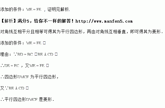 已知,如图,在中,是边上的一点,且,于点,交于点,请再添加一个条件,使四边形是菱形,并加以证明.