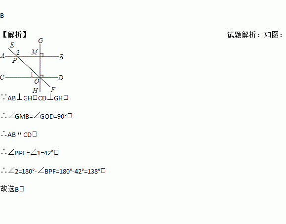 B 【解析】试题解析:如图: ∵AB⊥GH,CD⊥GH, ∴∠GMB=∠GOD=90°, ∴AB∥CD, ∴∠BPF=∠1=42°, ∴∠2=180°-∠BPF=180°-42°=138°, 故选B.