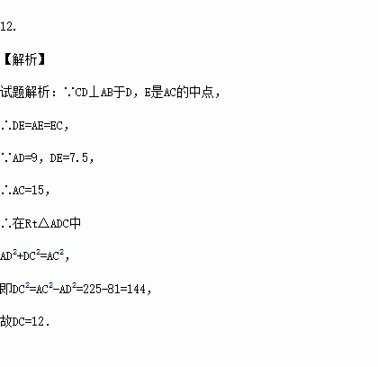 如图,△ABC中,CD⊥AB于D,E是AC的中点,若AD=9,DE=7.5,则CD的长为 .