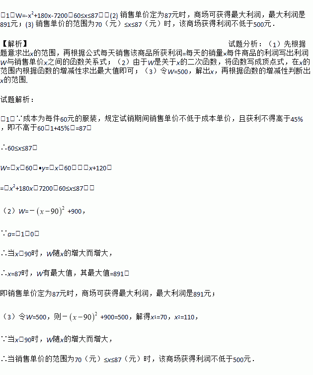 (1)W=-x2+180x-7200(60≤x≤87);(2) 销售单价定为87元时,商场可获得最大利润,最大利润是891元;(3) 销售单价的范围为70(元)≤x≤87(元)时,该商场获得利润不低于500元. 【解析】试题分析:(1)先根据题意求出x的范围,再根据公式每天销售该商品所获利润=每天的销量×每件商品的利润写出利润W与销售单价x之间的函数关系式;(2)由于W是关于x的二次函数,将...