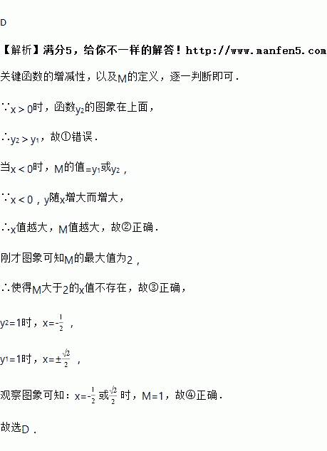 已知抛物线y1=﹣2x2+2,直线y2=2x+2,当x任取一值时,对应的函数值分别为y1、y2.若y1≠y2,取y1、y2中的较小值记为M;若y1=y2,记M=y1.例如:当x=1时,y1=0,y2=4,y1<y2,此时M=0.下列判断:①当x>0时,y1>y2;②当x<0时,x值越大,M值越大;③使得M大于2的x值不存在;④使得M=1的x值是﹣