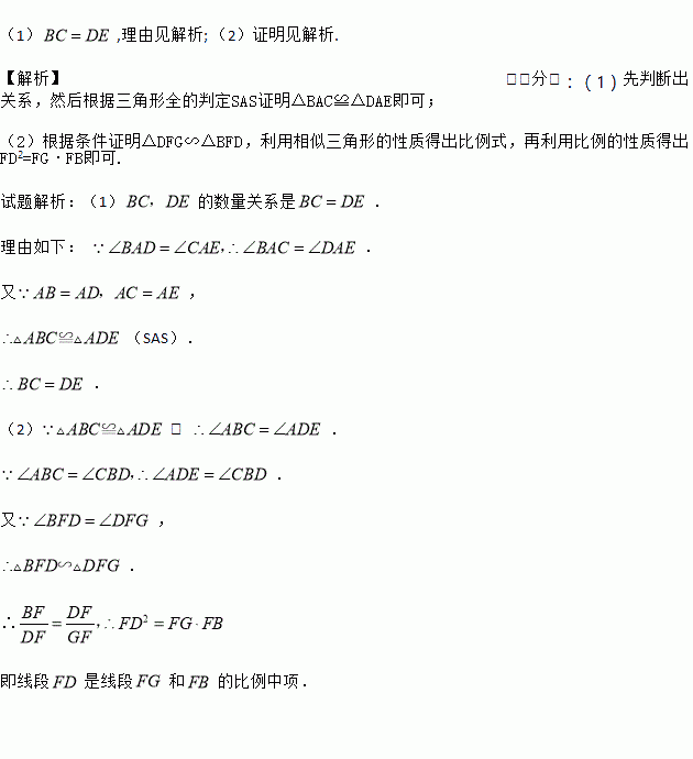 (1),理由见解析; (2)证明见解析. 【解析】试题分析:(1)先判断出关系,然后根据三角形全的判定SAS证明△BAC≌△DAE即可; (2)根据条件证明△DFG∽△BFD,利用相似三角形的性质得出比例式,再利用比例的性质得出FD2=FG·FB即可. 试题解析:(1)的数量关系是. 理由如下: . 又, (SAS). . (2), . . ...
