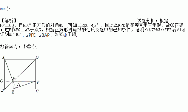 如图,点P为正方形ABCD的对角线BD上任一点,过点P作PE⊥BC,PF⊥CD,垂足分别为点E、F,连接EF.下列结论:①△FPD是等腰直角三角形;②AP=EF;③AD=PD;④∠PFE=∠BAP.其中正确的结论是__.(请填序号)