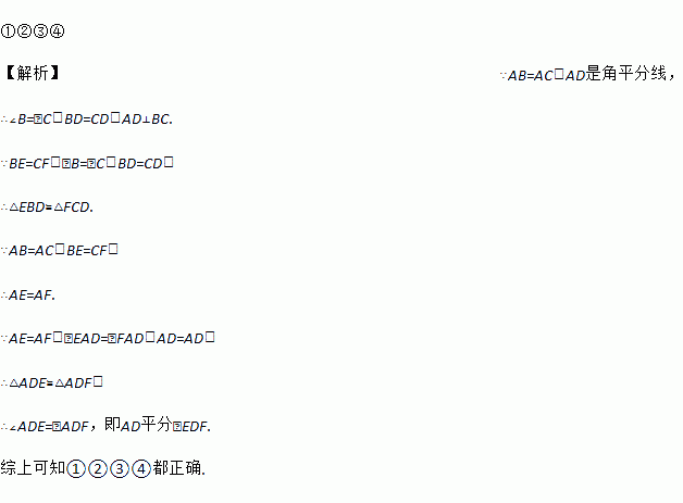 如图,在△ABC中,AB=AC,AD是角平分线,BE=CF,则下列说法中:①DA平分∠EDF;②△EBD≌△FCD;③BD=CD;④AD⊥BC.正确的是____________.(填序号)