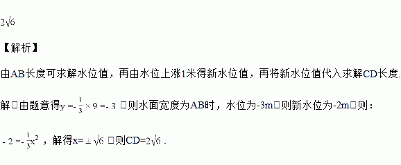 在如图所示的平面直角坐标系中,桥孔抛物线对应的二次函数关系式是,桥下的水面宽为.当水位上涨时,水面宽为________(结果保留根号).
