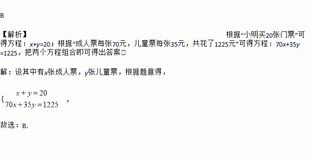 楠溪江某景点门票价格:成人票每张70元,儿童票每张35元.小明买20张门票共花了1225元,设其中有x张成人票,y张儿童票,根据题意,下列方程组正确的是( )