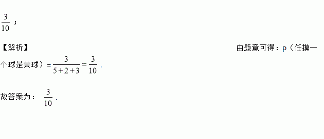 在一个不透明的布袋中装有5个红球,2个白球,3个黄球,它们除了颜色外其余都相同,从袋中任意摸出一个球,是黄球的概率为_____.