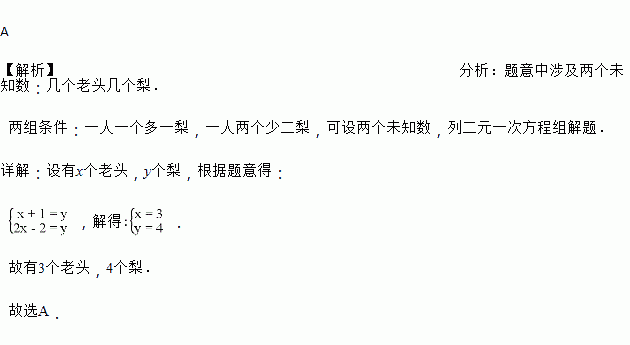 A. 3个老头4只梨 B. 4个老头3只梨 C. 5个老头6只梨 D. 7个老头8只梨