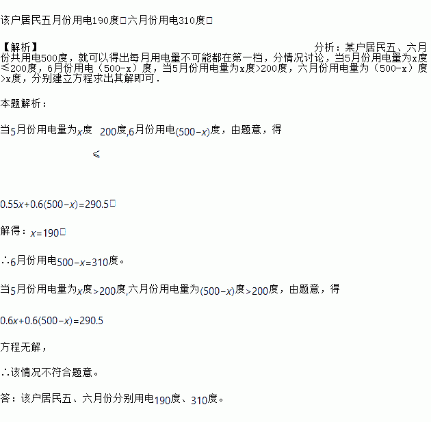 某户居民五、六月份共用电500度,缴电费290.5元.已知该用户六月份用电量大于五月份,且五、六月份的用电量均小于400度,问该户居民五、六月份各用电多少度?