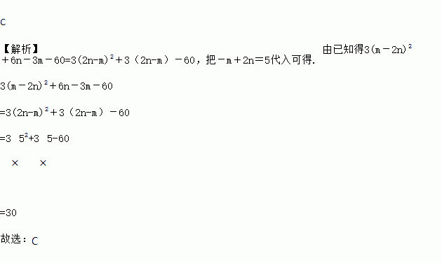 已知-m+2n=5,那么3(m-2n)2+6n-3m-60的值是( )