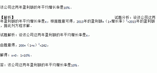 某公司在2013年的盈利额为200万元,预计2015年的盈利额将达到242万元,若每年比上一年盈利额增长的百分率相同,求该公司这两年盈利额的年平均增长率是多少?