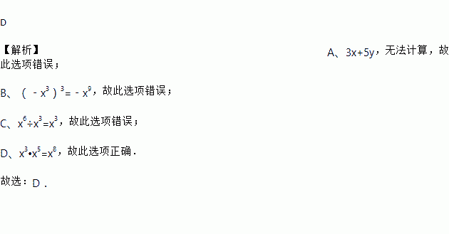 A. 3x+5y=8xy B. (﹣x3)3=x6 C. x6÷x3=x2 D. x3•x5=x8