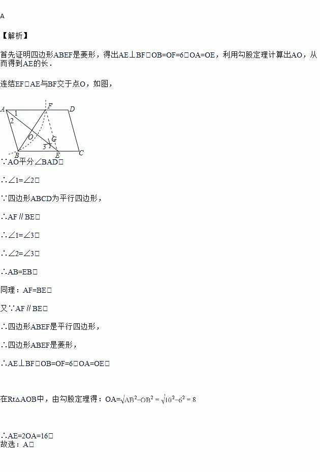 如图,在平行四边形ABCD中,用直尺和圆规作∠BAD的平分线AG交BC于点E,以点A为圆心,AB长为半径画弧交AD于F,若BF=12,AB=10,则AE的长为( )
