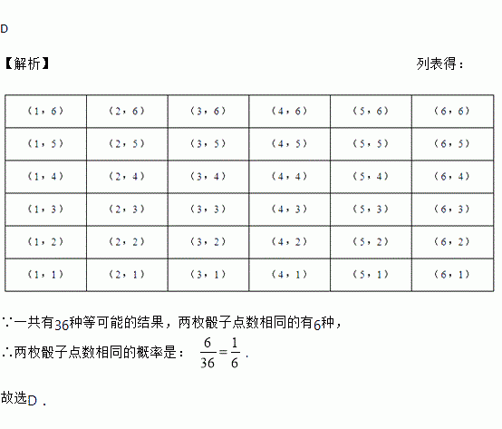连掷两枚质地均匀的骰子,它们的点数相同的概率是