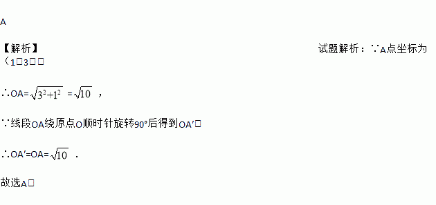 如图,已知A(1,3),将线段OA绕原点O顺时针旋转90°后得到OA′,则OA′的长度是( )