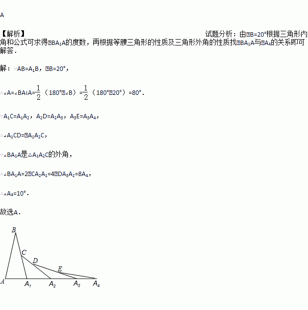 如图,已知AB=A1B,A1C=A1A2,A2D=A2A3,A3E=A3A4,∠B=20°,则∠A4=( )