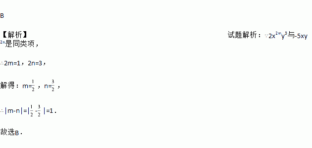 B 【解析】试题解析:∵2x2my3与-5xy2n是同类项, ∴2m=1,2n=3, 解得:m=,n=, ∴|m-n|=|-|=1. 故选B.