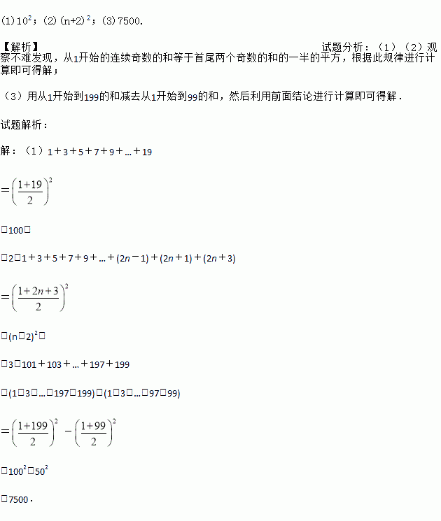 (1)102;(2)(n+2)2;(3)7500. 【解析】试题分析:(1)(2)观察不难发现,从1开始的连续奇数的和等于首尾两个奇数的和的一半的平方,根据此规律进行计算即可得解; (3)用从1开始到199的和减去从1开始到99的和,然后利用前面结论进行计算即可得解. 试题解析: 【解析】 (1)1+3+5+7+9+…+19 = =100; (2)1+3...