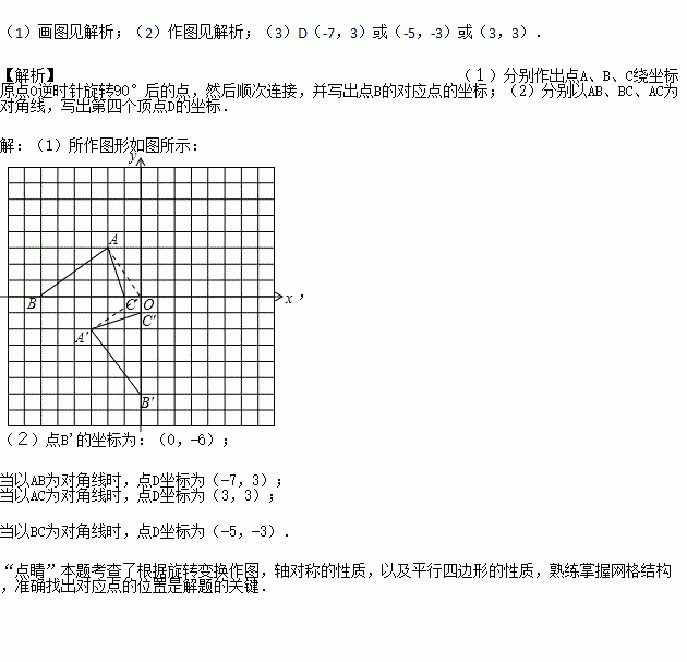 (2)将△ABC绕坐标原点O逆时针旋转90°,画出图形,直接写出点B的对应点的坐标;