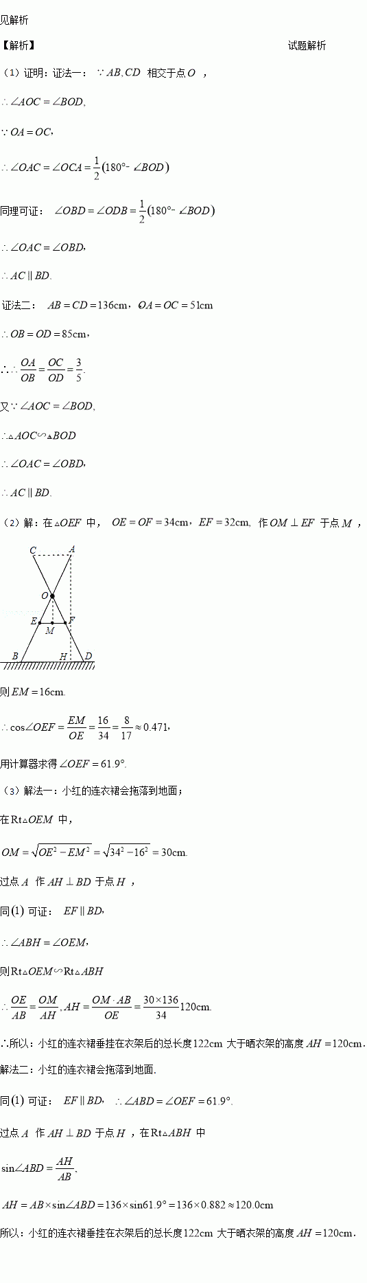 (3)小红的连衣裙穿在衣架后的总长度达到122cm,垂挂在晒衣架上是否会拖落到地面?请通过计算说明理由.