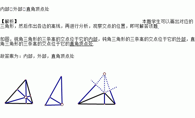 锐角三角形的三条高的交点位于它的_______,钝角三角形的三条高的交点位于它的_____,直角三角形的三条高的交点位于它的______.