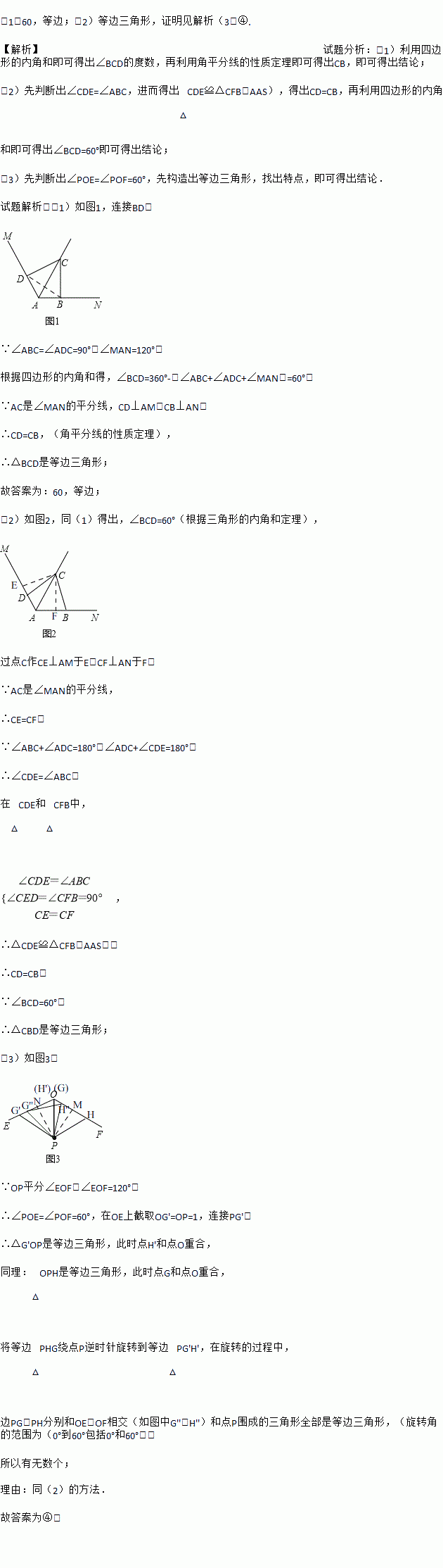 (3)如图3,已知∠EOF=120°,OP平分∠EOF,且OP=1,若点G,H分别在射线OE,OF上,且△PGH为等边三角形,则满足上述条件的△PGH的个数一共有 .(只填序号)