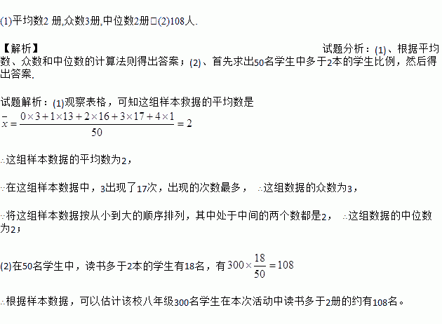 (1) 这50个样本数据的平均数是 册,众数是 册,中位数是 册;