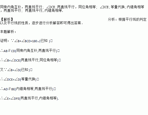 如图,已知∠B+∠BCD=180°,∠B=∠D.