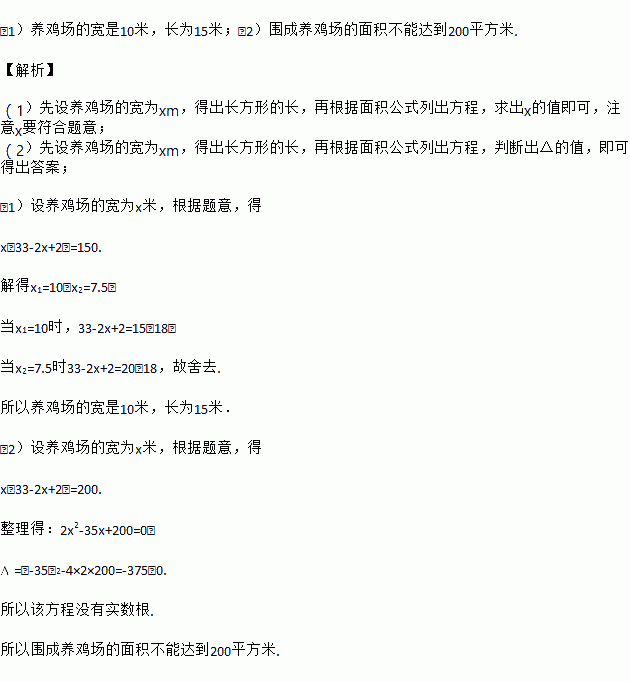 (1)若墙长为18米,要围成鸡场的面积为150平方米,则鸡场的长和宽各为多少米?