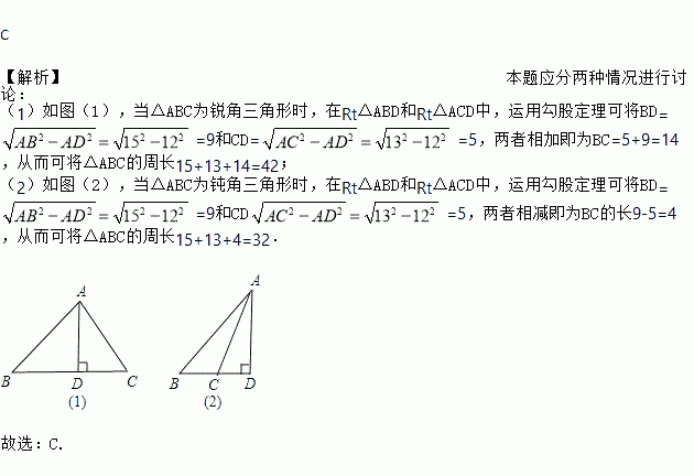 △ABC中,AB=15,AC=13,高AD=12,则△ABC的周长为( )