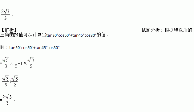 . 【解析】试题分析:根据特殊角的三角函数值可以计算出tan30°cos60°+tan45°cos30°的值. 【解析】 tan30°cos60°+tan45°cos30° = = =.