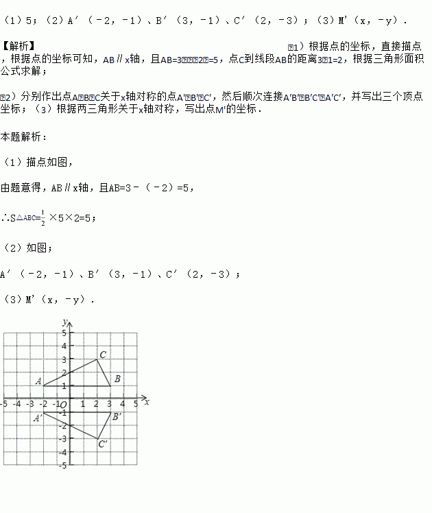 (2)在平面直角坐标系中画出△A′B′C′,使它与△ABC关于x轴对称,并写出△A′B′C′三顶点的坐标;