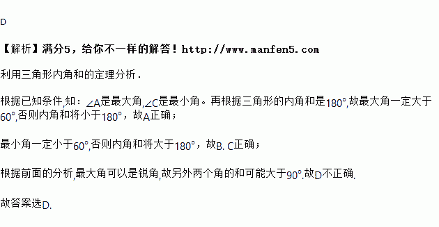 A. ∠A>60° B. ∠B>45° C. ∠C<60° D. ∠B+∠C<90°