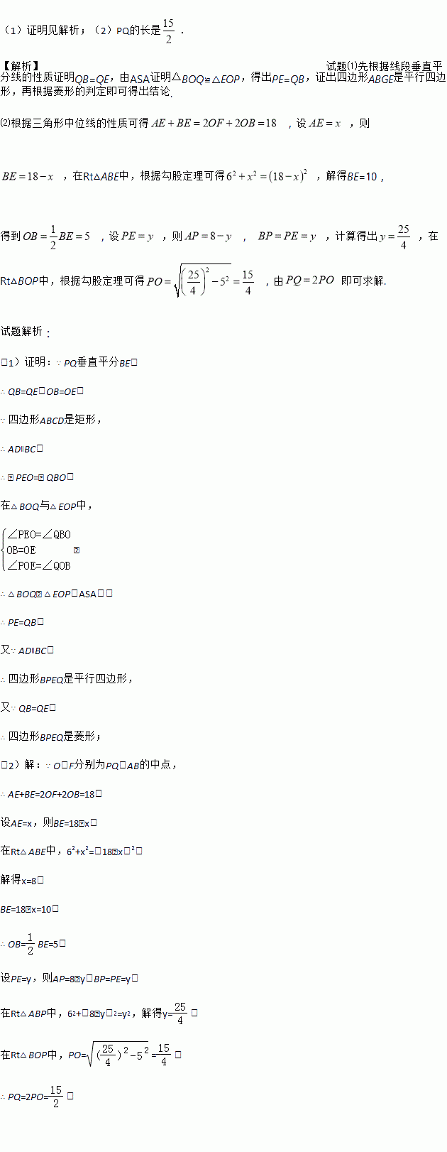 如图,在矩形ABCD中,E是AD上一点,PQ垂直平分BE,分别交AD、BE、BC于点P、O、Q,连接BP、EQ.