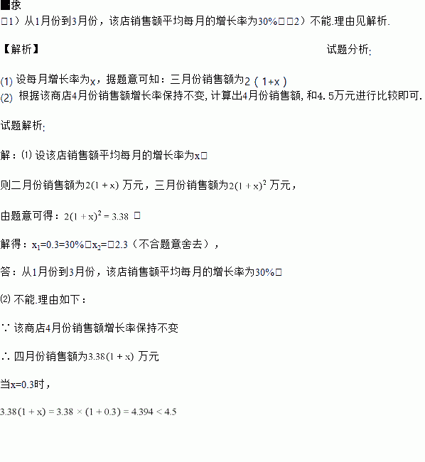 (2)如果该商店4月份销售额增长率保持不变,销售额能否达到4.5万元,若不能,请说明理由.