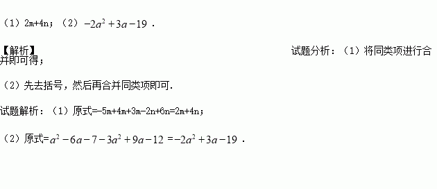 化简:(1)﹣5m+4m﹣2n+6n+3m (2)(a2﹣6a﹣7)﹣3(a2﹣3a+4)