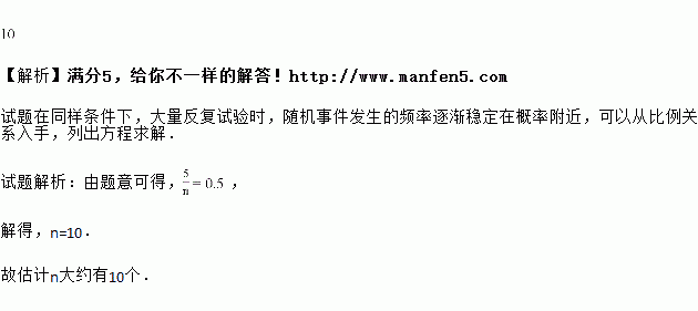 在一个不透明的袋中装有除颜色外其余均相同的n个小球,其中有5个黑球,从袋中随机摸出一球,记下其颜色,把它放回袋中,搅匀后,再摸出一球,…通过多次试验后,发现摸到黑球的频率稳定于0.5,则n的值大约是 ________.