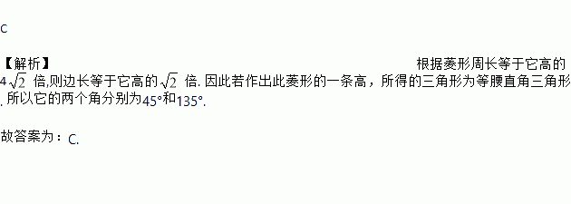 C 【解析】根据菱形周长等于它高的4倍,则边长等于它高的倍. 因此若作出此菱形的一条高,所得的三角形为等腰直角三角形. 所以它的两个角分别为45°和135°. 故答案为:C.