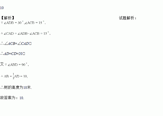 如图,树AB垂直于地面,为测树高,小明在C处测得∠ACB=15°,他沿CB方向走了20米,到达D处,测得∠ADB=30°,则计算出树的高度是__________米.