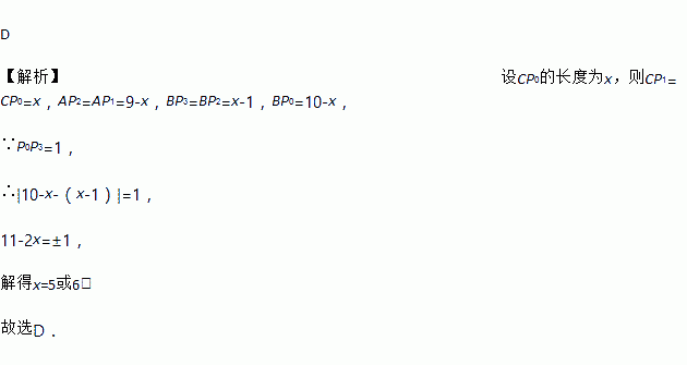 D 【解析】设CP0的长度为x,则CP1=CP0=x,AP2=AP1=9-x,BP3=BP2=x-1,BP0=10-x, ∵P0P3=1, ∴|10-x-(x-1)|=1, 11-2x=±1, 解得x=5或6. 故选D.