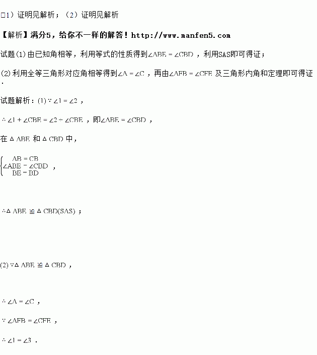如图,点E在CD上,BC与AE交于点F,AB=CB,BE=BD,∠1=∠2.