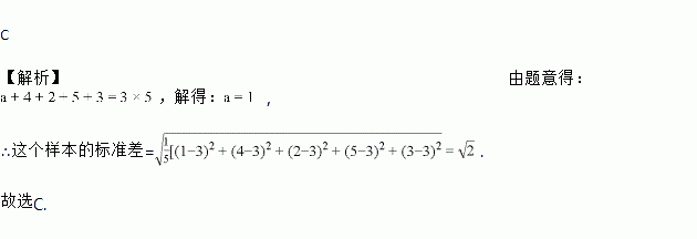已知一个样本a , 4,2,5,3,它的平均数是3,则这个样本的标准差为( ).