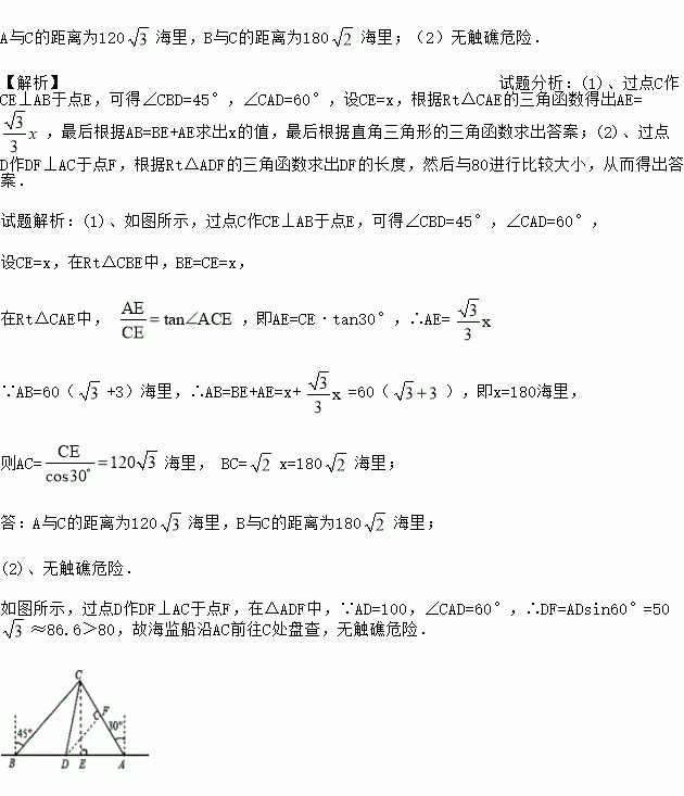 (2)已知在灯塔D周围80海里范围内有暗礁群,在A处海监船沿AC前往C处盘看,图中有无触礁的危险?请说明理由.