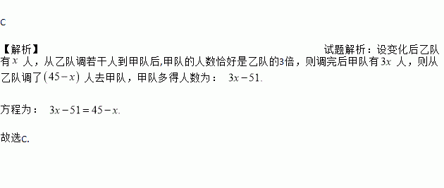 ¼×¶ÓÓÐ51¸öÈË,ÒÒ¶ÓÓÐ45¸öÈË,´ÓÒÒ¶Óµ÷Èô¸ÉÈ˵½¼×¶Óºó,¼×¶ÓµÄÈËÊýÇ¡ºÃÊÇÒÒ¶ÓµÄ3±¶,Çó±ä»¯ºóÒÒ¶ÓÓжàÉÙÈË£¿ÈôÉè±ä»¯ºóÒÒ¶ÓÓÐxÈË,¿ÉÁз½³ÌΪ£º