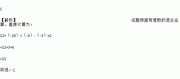 计算12+(﹣18)÷(﹣6)﹣(﹣3)×2的结果是( )